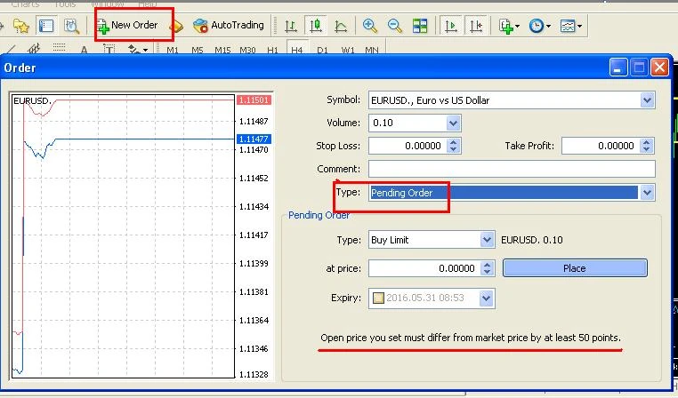 3. Untuk minimal SL / TP, anda bisa cek dengan Klik NEW ORDER di MT4 yang anda gunakan. Dengan Model Type Order Pending, yang dalam contoh dibawah ini dengan garis merah. Dan ntuk maksimal tidak terbatas.