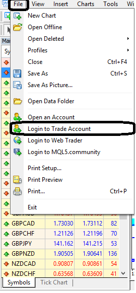 Untuk log in di platform Metatrader, masuk ke File - Login to Trade Account - isi nomor Login, Password, dan alamat Server.